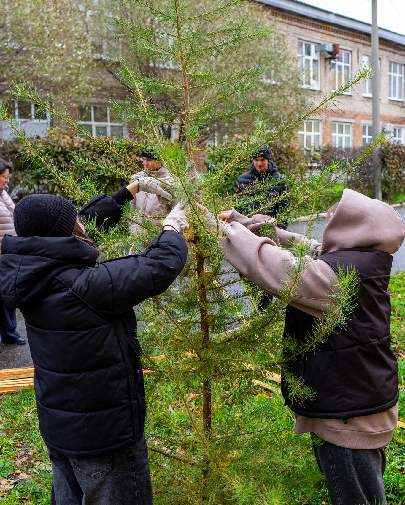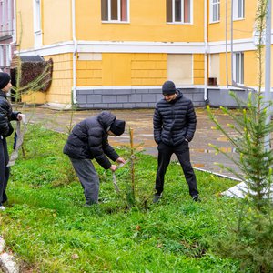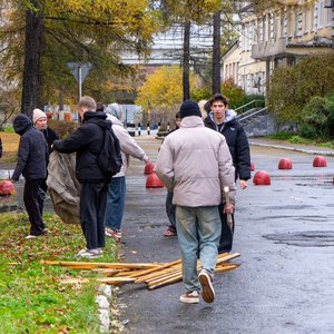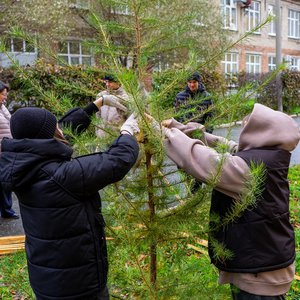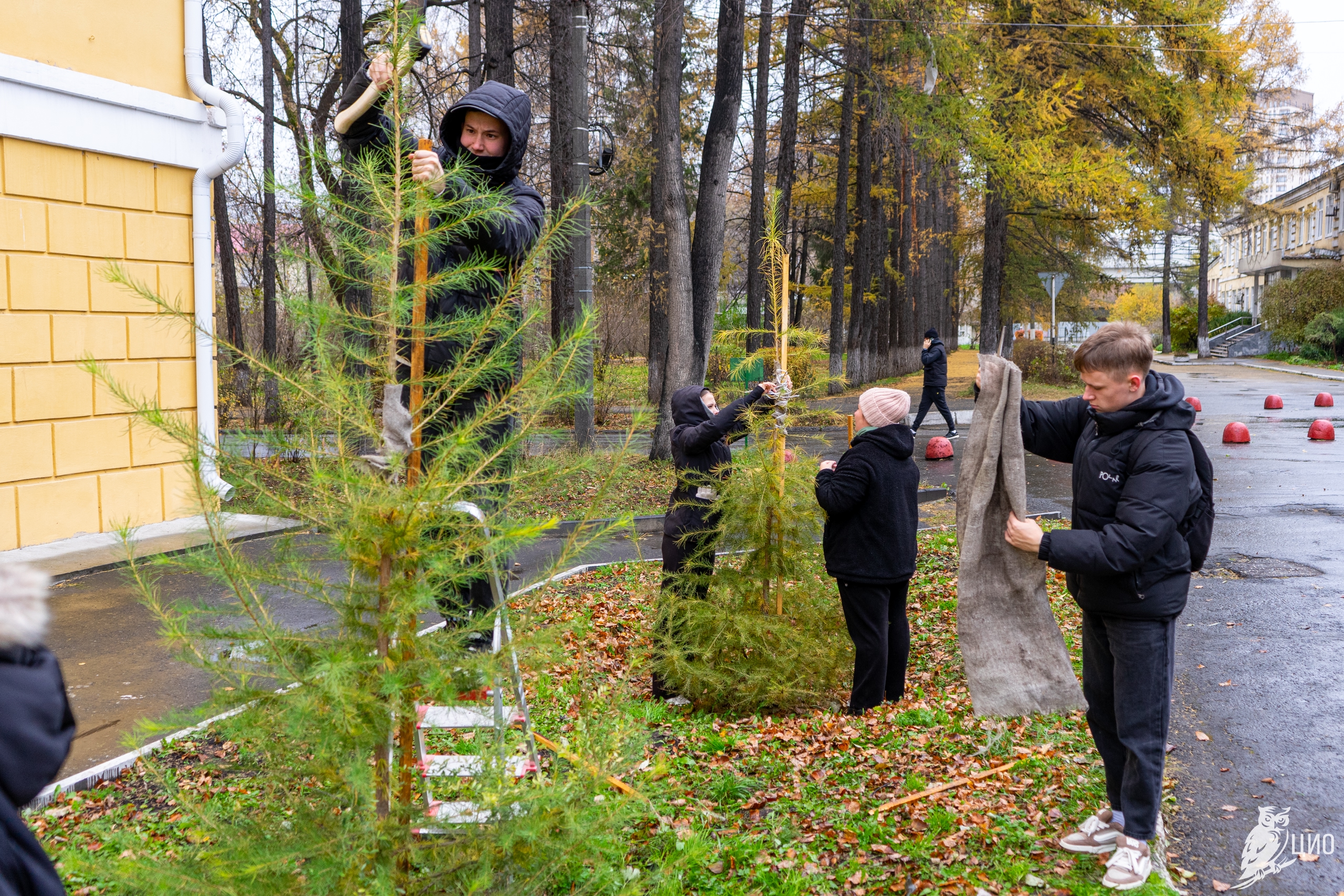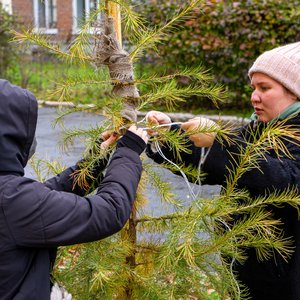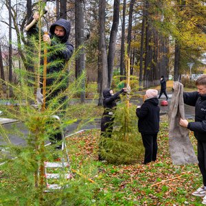 В рамках учебных занятий по лесоразведению и воспроизводству лесов студенты 1-го и 2-го курса Уральского лесотехнического колледжа провели подвязку и крепление деревьев лиственницы сибирской, которые были посажены вместо аварийных тополей у здания колледжа. Лиственница в этом году сильно подалась и значительно подросла, чтобы зимой саженцы не пострадали студенты укрепили их колышками.